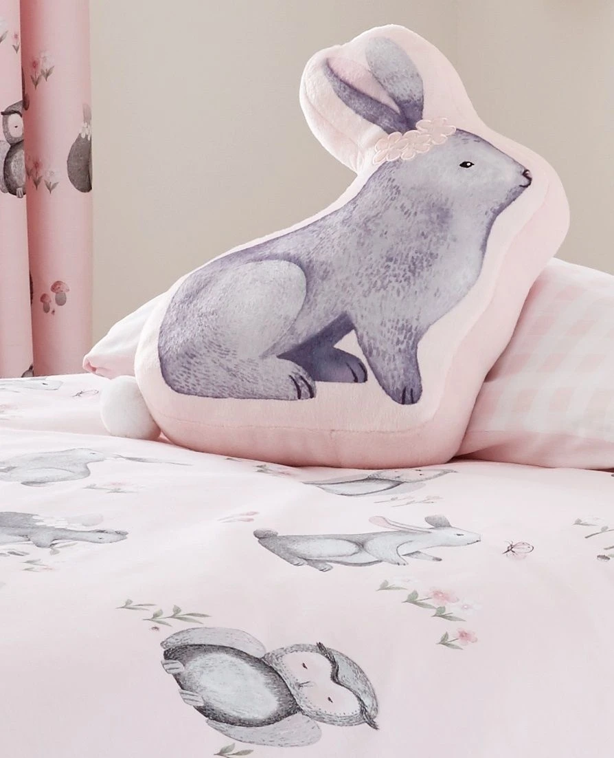 A cute 3D cushion with adorable pompom tail is the perfect addition to any woodland themed bedroom. Beautifully illustrated woodland friends design on a pretty pink base.